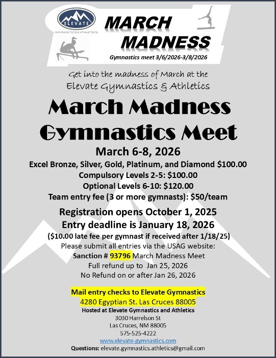 We are excited to announce the 2026 Elevate Gymnastics March Madness Meet to be held March 6th through the 8th in Las Cruces NM. So, please save the date. Registration opens October 1st, 2025.